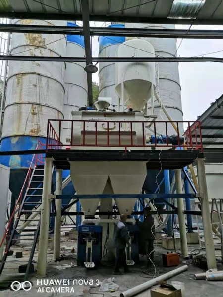 該型號(hào)設(shè)備由原料倉、輸送螺旋、配料秤、斗式提升機(jī)、雙軸無重力混合機(jī)、主機(jī)平臺(tái)、成品倉、自動(dòng)包裝機(jī)、除塵器等組成。主要用于生產(chǎn)石膏砂漿、抹灰石膏砂漿等產(chǎn)品。